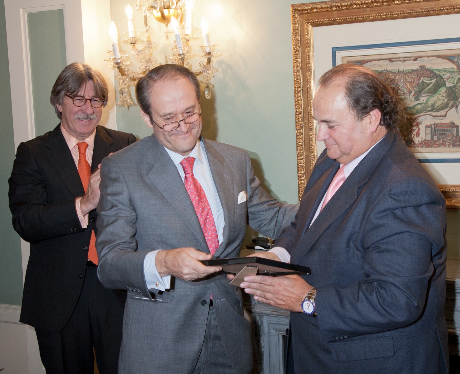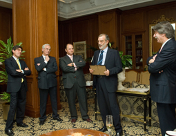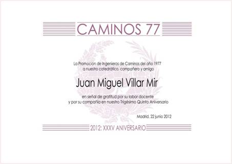 En una entrañable ceremonia celebrada esta tarde en su despacho de Torre Espacio, una comisión de compañeros ha entregado a Juan Miguel Villar Mir el Diploma del XXXV Aniversario y el metracrilato conmemorativo. . El empresario fue Catedrático de Organización de Empresas de 5º curso de la promoción de Caminos77, aunque su nombramiento en aquel momento como Vicepresidente del Gobierno de España le impidió la asistencia normal a clase.