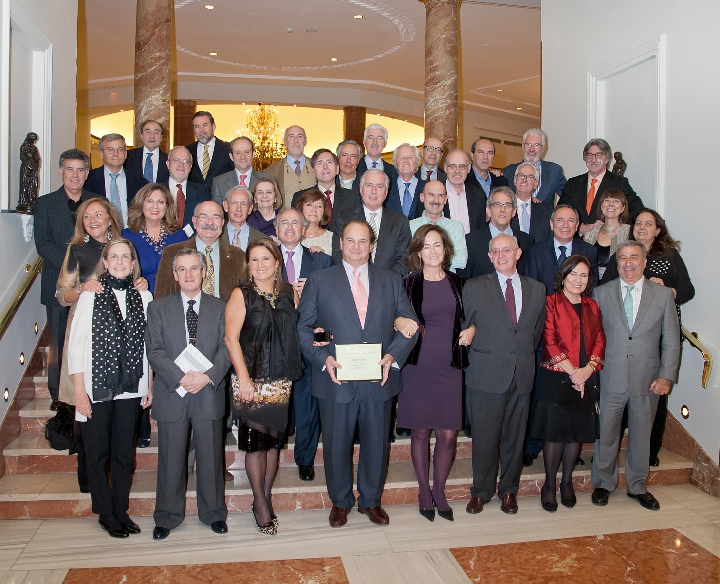 El pasado día 28 noviembre se celebró un año mas la Cena Anual de la Promoción.Ver galería I. Como es habitual el lugar elegido fue el Hotel Intercontinental y se dieron cita allí un total de 54 compañeros y sus esposas.(Ver lista asistentes). Se hizo entrega al querido compañero Antón Pradera del Diploma de Caminero de Honor 2011. Ver Diploma. Ver galería II. El premiado fue presentado por Carlos Corral con palabras elocuentes y muy sentidas.(Ver texto). Como es costumbre, al termino de la cena se tomó la foto de grupo. (Descarga fichero alta resolución)