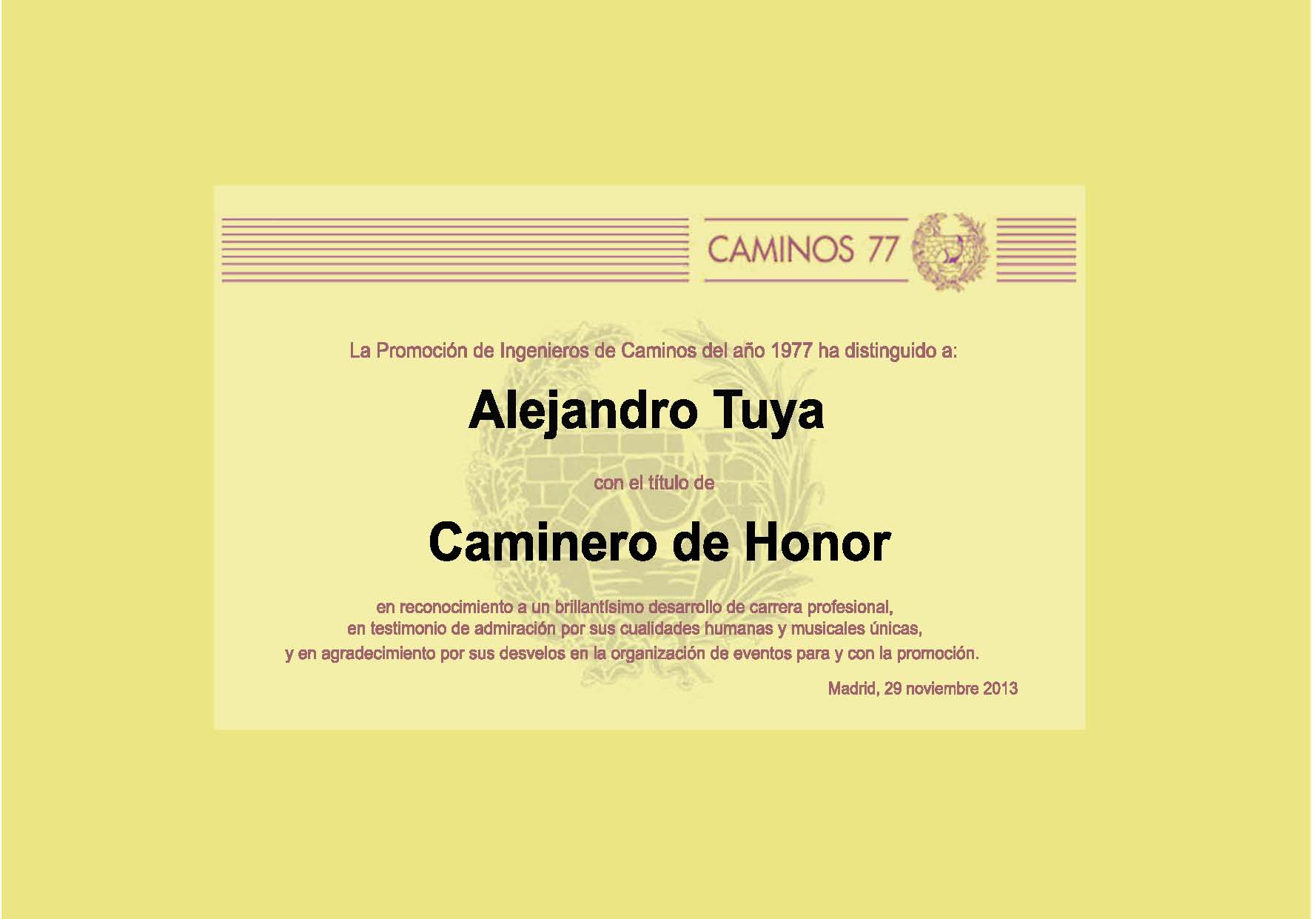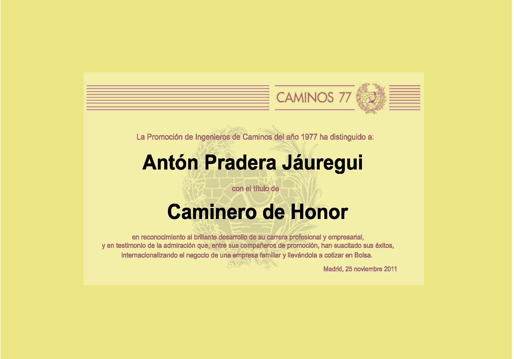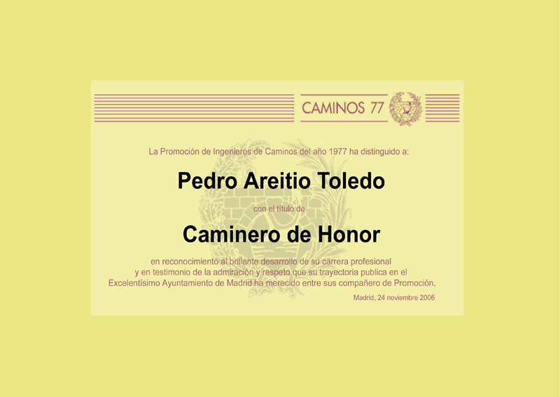 Esta tarde se ha anunciado la designación de nuestro compañero Pedro Areitio como Caminero de Honor de la Promoción. Esta nueva distinción ha sido recientemente instituida por la Promoción para distinguir, de entre sus miembros, a aquellos que sobresaliendo en el ejercicio de su actividad profesional, han conseguido continuar y reforzar la imagen que la sociedad española ha tenido siempre de los Ingenieros de Caminos. El diploma que acredita tal distinción le ha sido entregado esta noche en el curso de la Cena Anual 2006 de la Promoción.