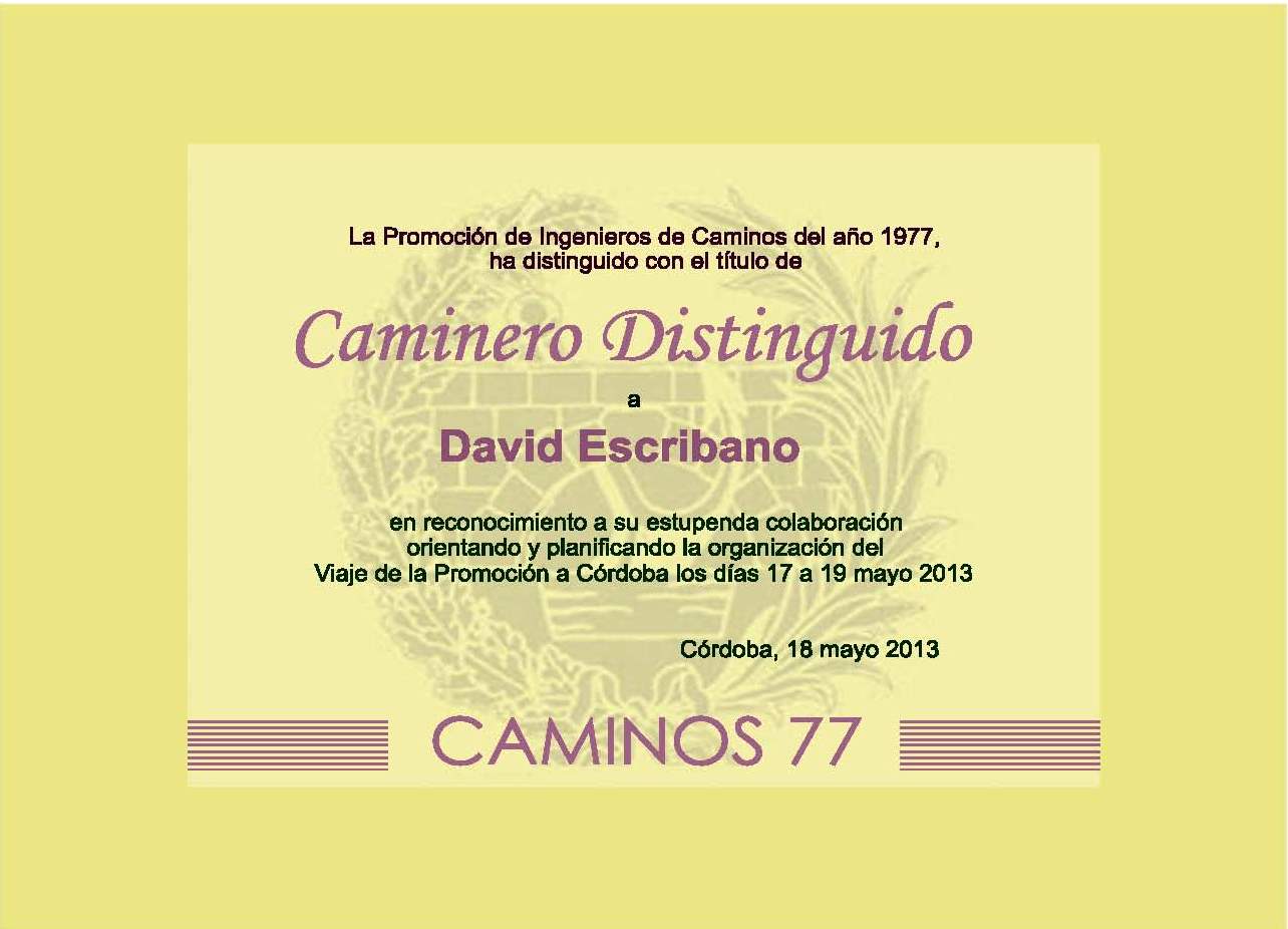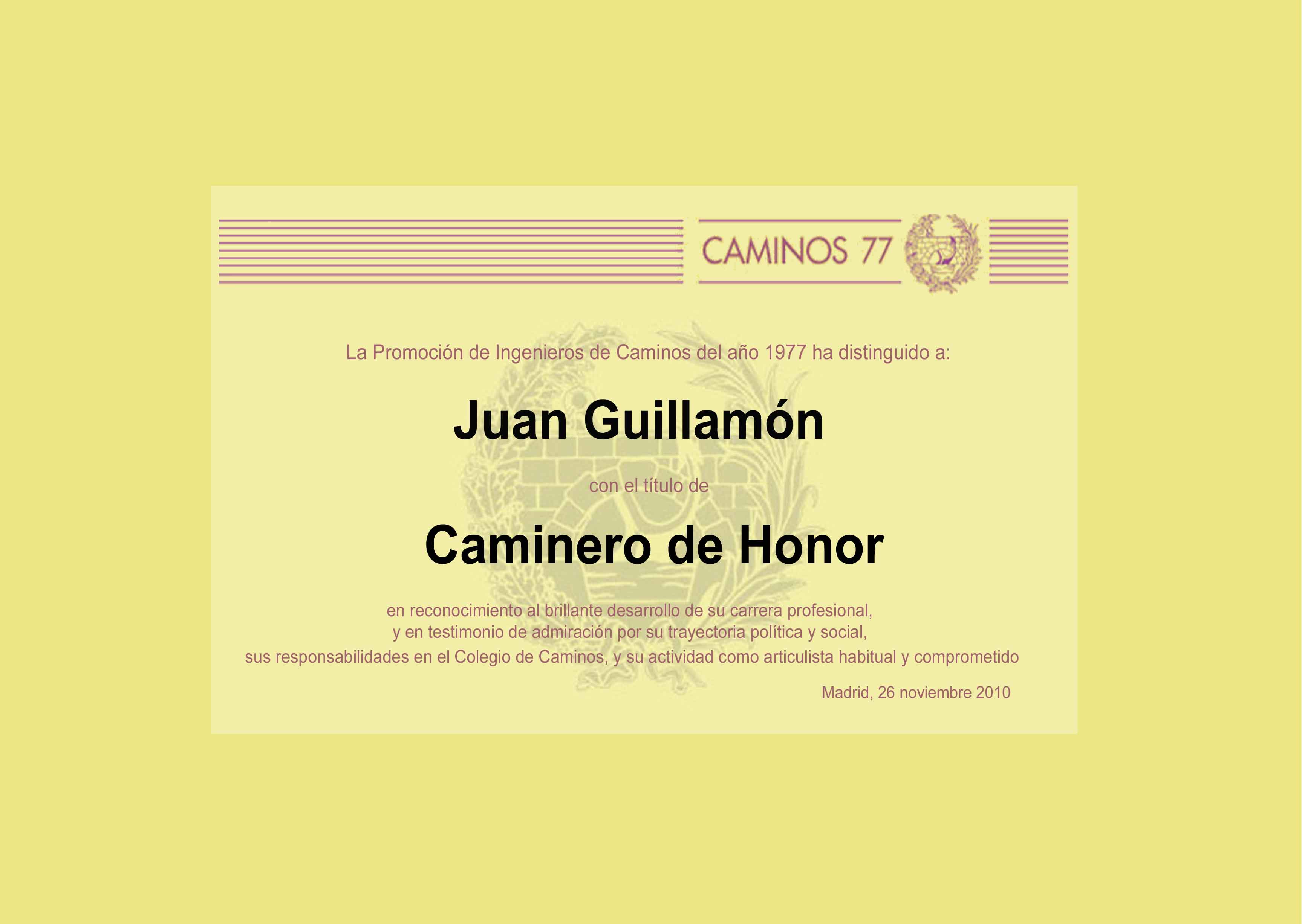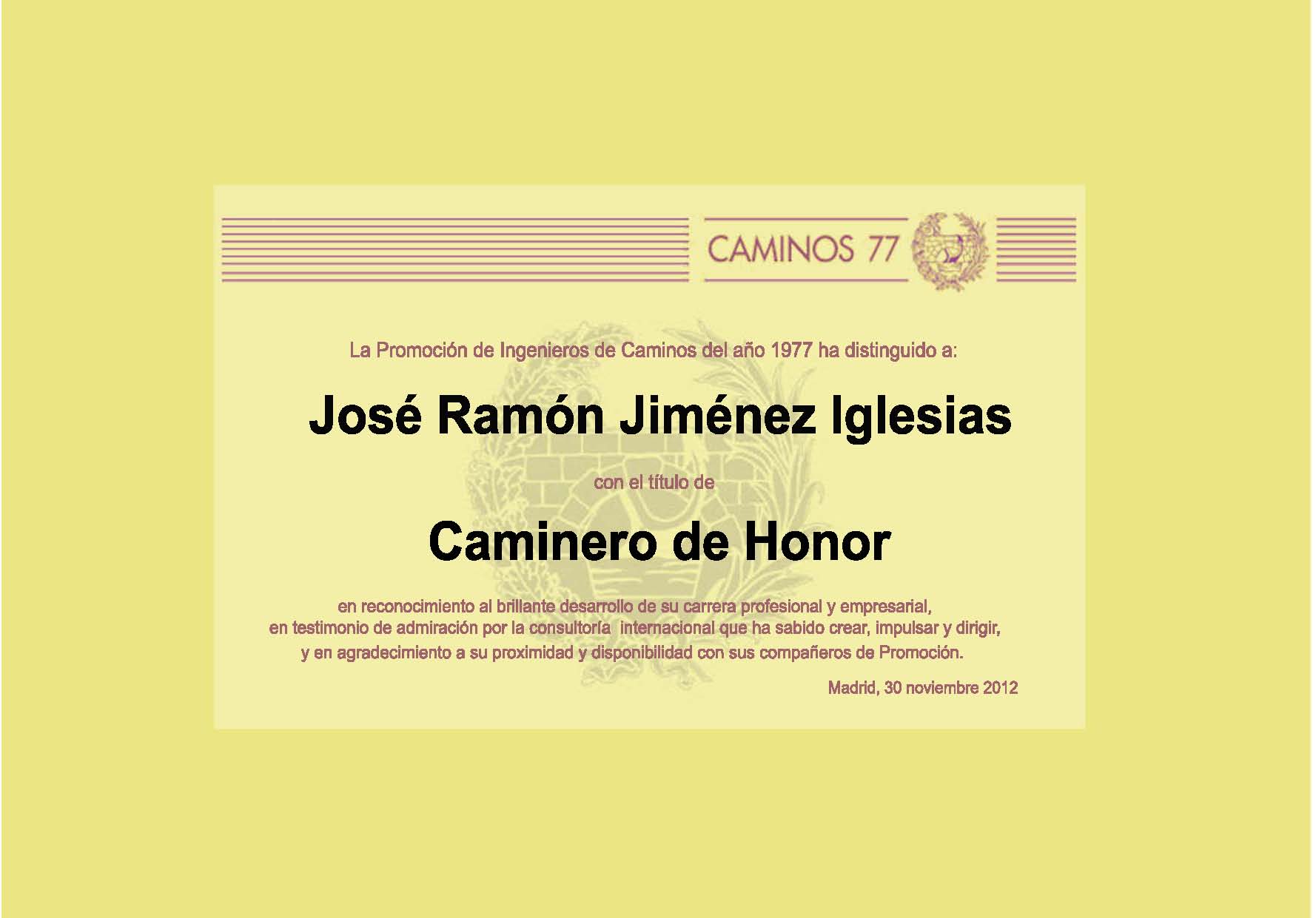 Esta tarde se ha anunciado la designación de nuestro compañero Pedro Areitio como Caminero de Honor de la Promoción. Esta nueva distinción ha sido recientemente instituida por la Promoción para distinguir, de entre sus miembros, a aquellos que sobresaliendo en el ejercicio de su actividad profesional, han conseguido continuar y reforzar la imagen que la sociedad española ha tenido siempre de los Ingenieros de Caminos. El diploma que acredita tal distinción le ha sido entregado esta noche en el curso de la Cena Anual 2006 de la Promoción.
