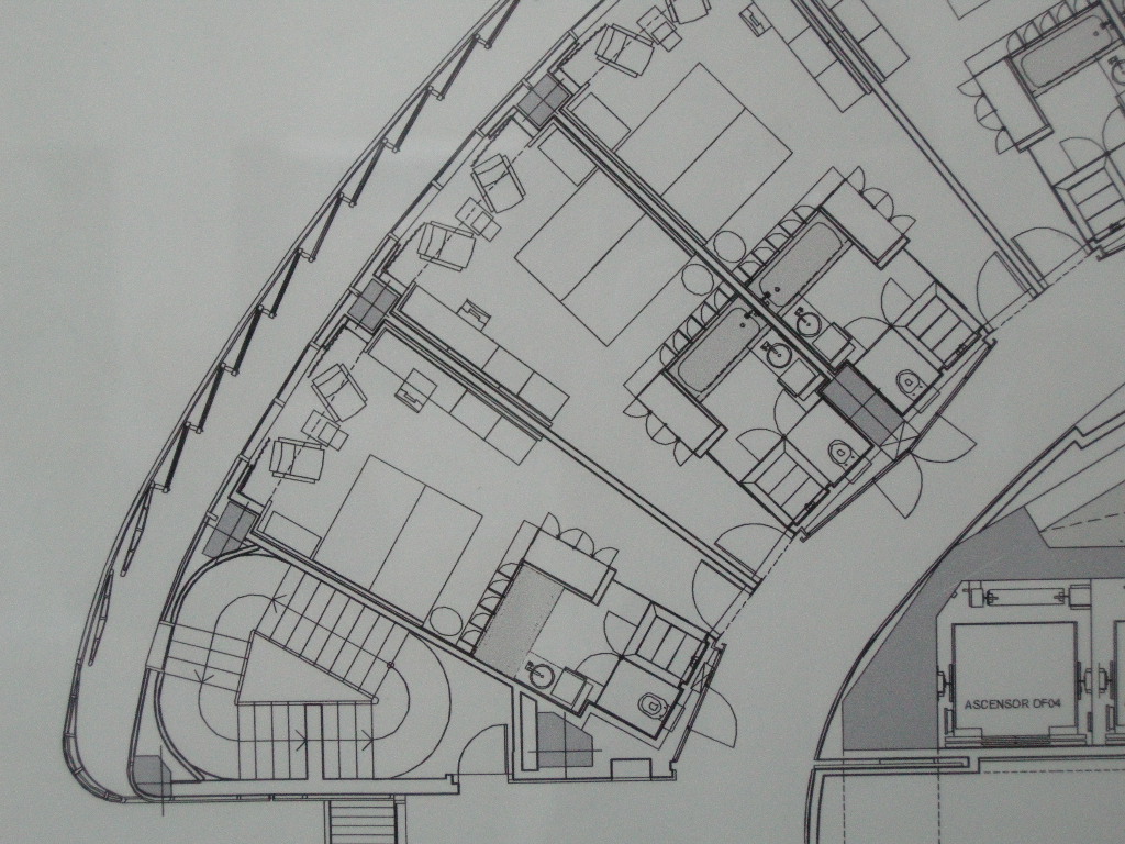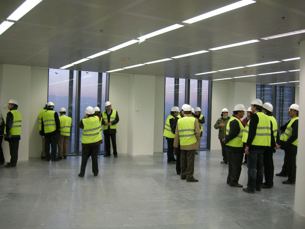 A continuación el grupo se dirigió a la Torre SyV, en donde esperaban, como representantes de Sacyr, la empresa constructora y propietaria, nuestro compañero de promoción Javier Gayo, que, junto a Tomás Cuadrado y Miguel García acompañaron al grupo y explicaron muchos detalles de la torre. Primero, subiendo hasta la Planta 52, dentro del grupo de las dedicadas a instalaciones, y luego bajando a una planta de oficinas, con espacios ya casi listos para ocupar, y a una de hotel, donde se entró en la habitación piloto que ya ha decorado Hotusa, la empresa que lo explotará bajo la marca Eurostars. Ver fotos.