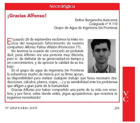 Fallece nuestro compañero de Promoción Alfonso Palma Villalón. En un artículo de la revista Voz del Colegiado encontramos un recuerdo especial a su memoria. Ver noticia