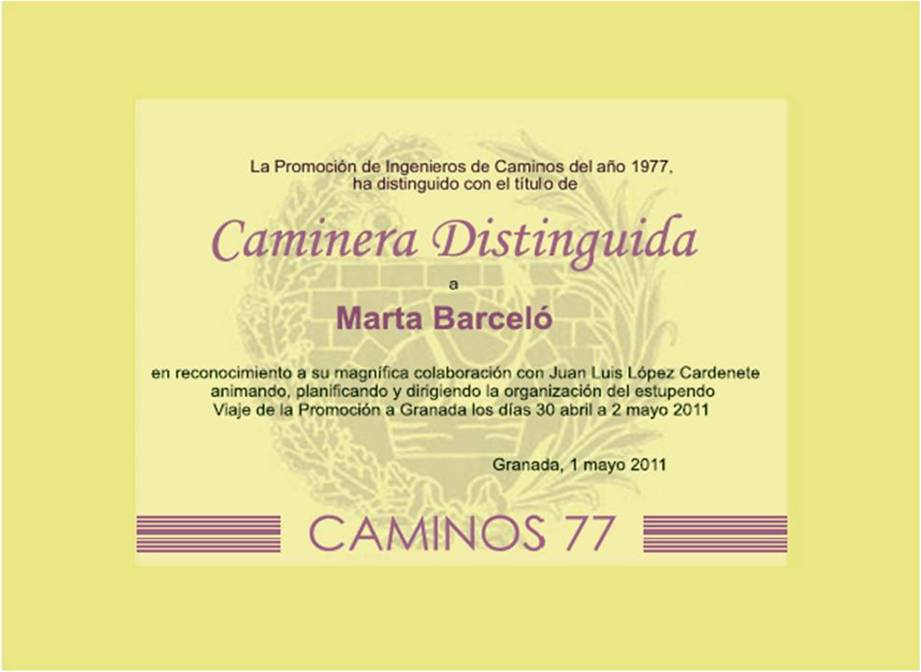 El pasado fin de semana se ha celebrado El Viaje Anual de la Promoción a Granada. Nuestro gran amigo Juan Luis López Cardenete y su mujer Marta Barceló, han sido los acertados organizadores de esta gran cita y es por ello que se ha otorgado, por primera vez, el Título de Caminera Distinguida ver Diploma. Con una asistencia de 39 personas, este viaje se ha convertido en uno de los mas concurridos. (ver lista asistentes). En Granada, el grupo, ha podido disfrutar, entre otros, de las vistas del Albaycín, donde se tomó la acostumbrada foto de grupo, el Sacromonte, la Judería y la Alhambra. foto de grupo. (Descarga fichero alta resolución)