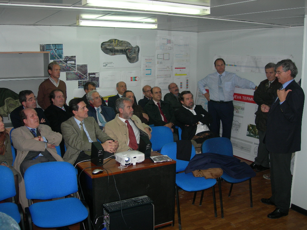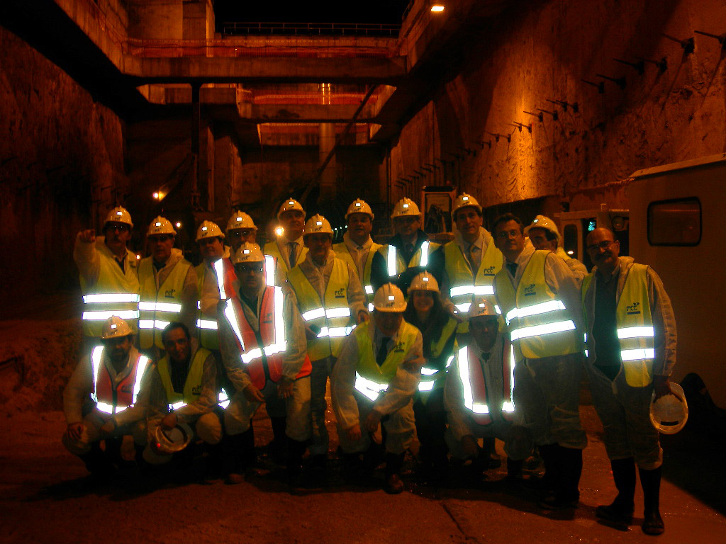 Un grupo de 17 compañeros ha asistido esta tarde, por cortesía de FCC, a una completísima visita de las obras que la Tuneladora La Adelantada está realizando en la ampliación de la línea 10 del Metro de Madrid. Ver lista asistentes. Esta ampliación, de 1.900 metros permitirá, a partir de marzo 2007, conectar la nueva terminal T4 de Barajas con el suburbano. El equipo directivo de FCC, encabezado por Ricardo Gil compañero de la promoción del 79, recibió al grupo en las oficinas de obra y, durante 1 hora estuvo explicando y contestando preguntas con todo lujo de detalles. Pertrechados de botas, trajes y chalecos y cascos, el grupo penetró por trenecillo hasta la cabecera de la excavación donde asistió a la colocación de un anillo completo de dovelas, y a explicaciones detalladas sobre el guiado por laser del escudo. Al final, ya solo se veían las bandas reflectoras